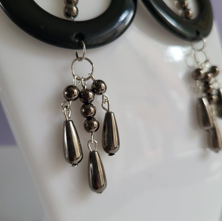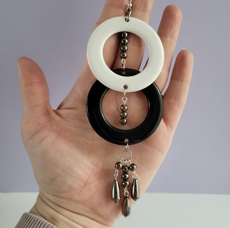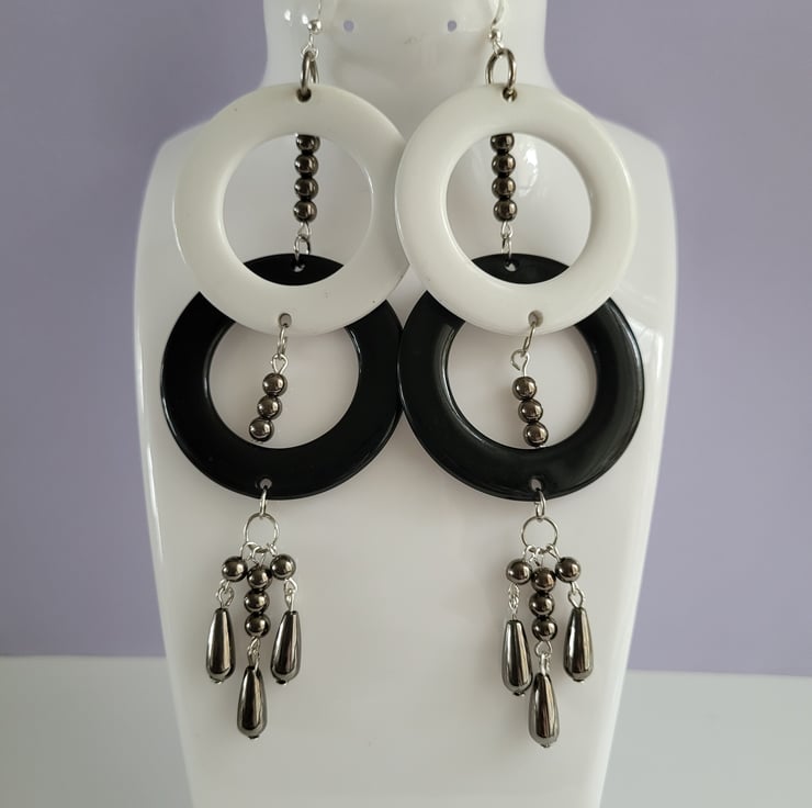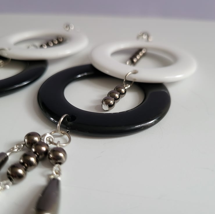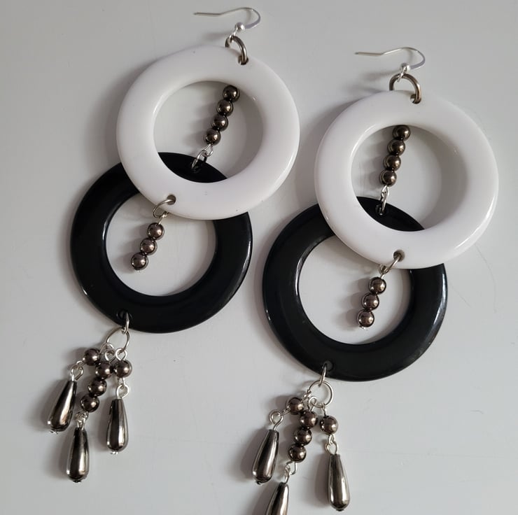Beautiful one of a kind Black and White Ring Earrings. These earrings started off as what looked like a necklace, but these pieces had become detached and they needed a new lease of life. They are made from upcycled materials, making them environmentally friendly and have a 13cm drop, Available with clip on or nickel free wires.