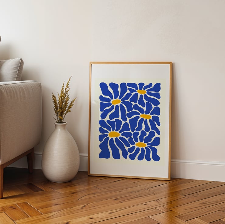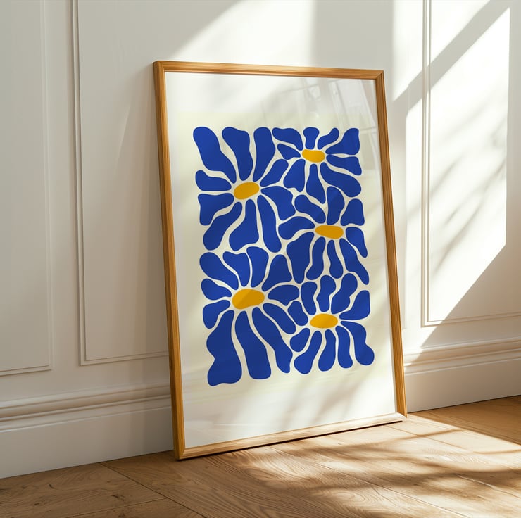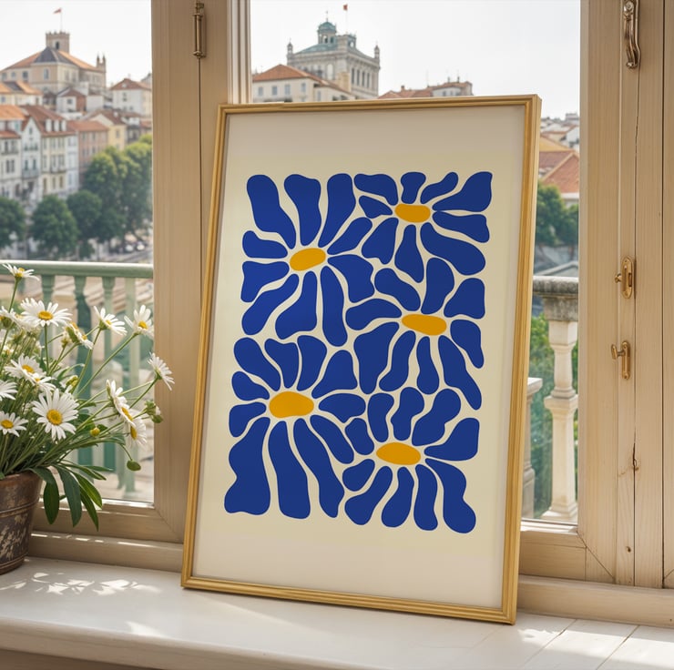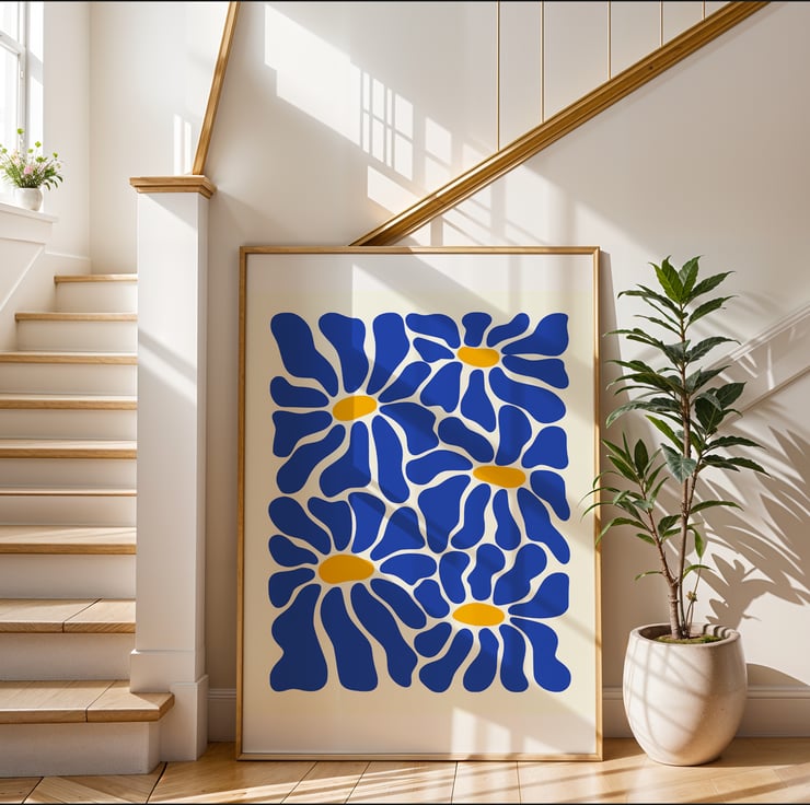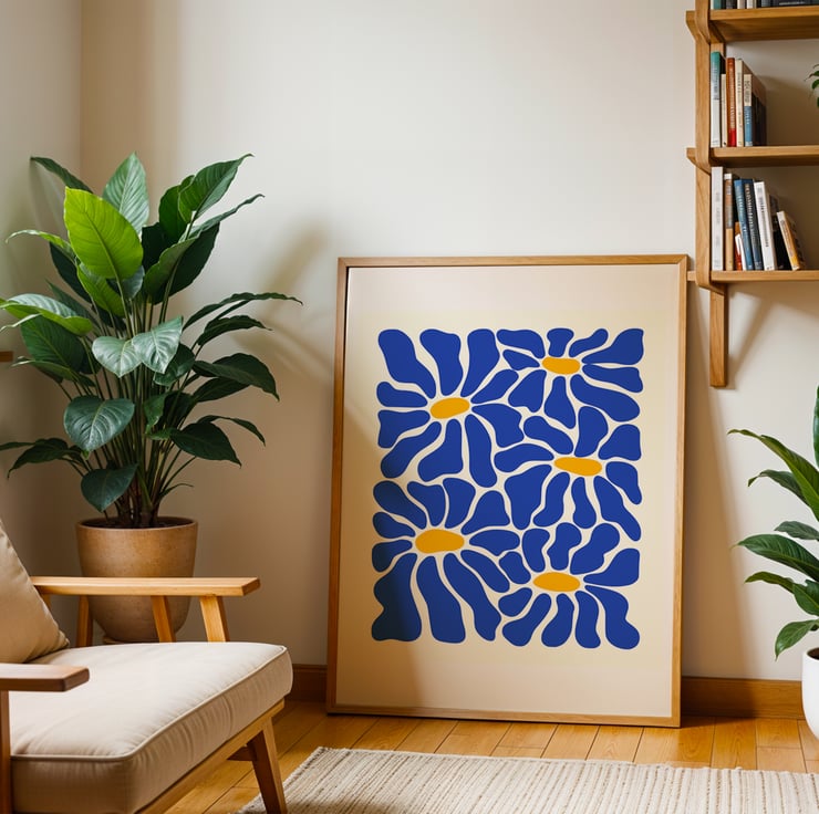 Add a pop of vibrant color to your space with this bold blue daisy art print. Inspired by retro florals and mid-century modern design, this piece features striking blue petals with warm golden centers, creating a playful yet sophisticated look. Perfect for brightening up a living room, bedroom, or creative space, this floral print brings a joyful, nostalgic charm to any interior. Printed on high-quality paper, it’s a stunning statement piece for lovers of vintage-inspired decor and bold botanical art.
