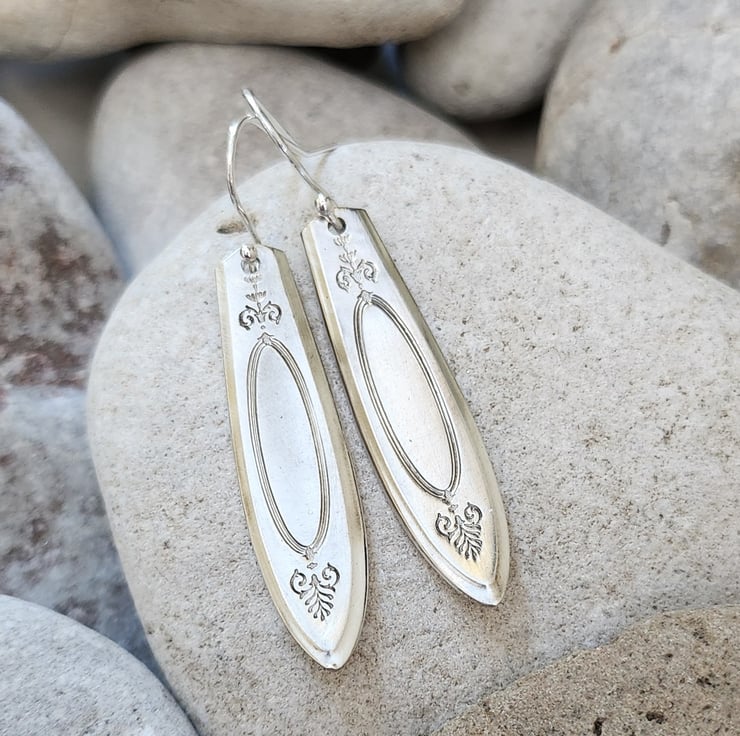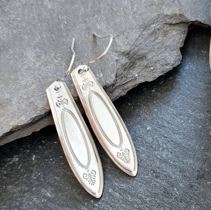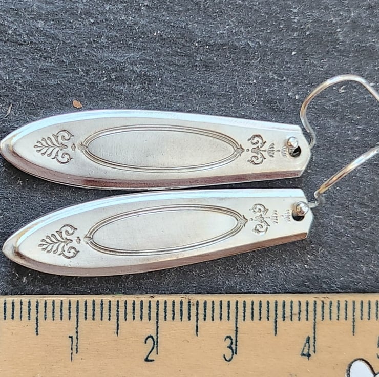 Earrings made from the ends of silverplated stainless steel coffeespoon handles. The pattern is called Adam and dates from 1917. Almost 4cms drop. Sterling silver ear hooks.