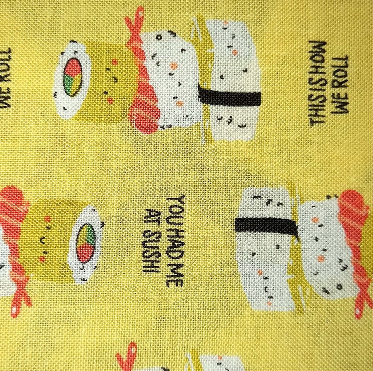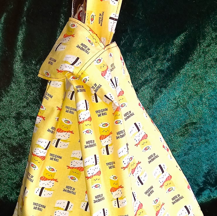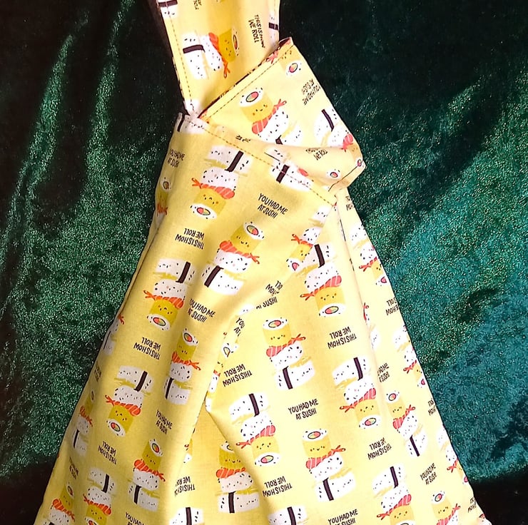 One side is made from gorgeous yellow fabric featuring a cute sushi print with wording 'you had me at sushi' and 'this is how we roll'. The other side is the has a black background with a Japanese label and Sake bottle print.