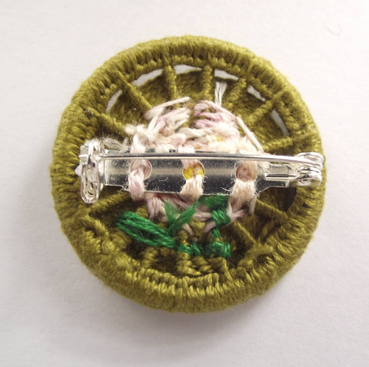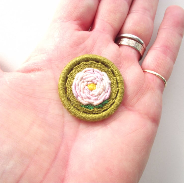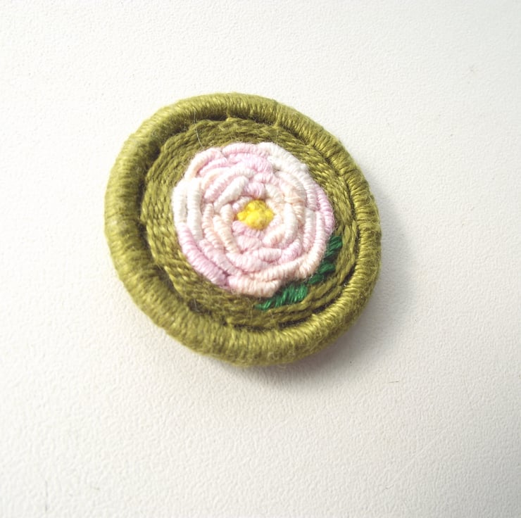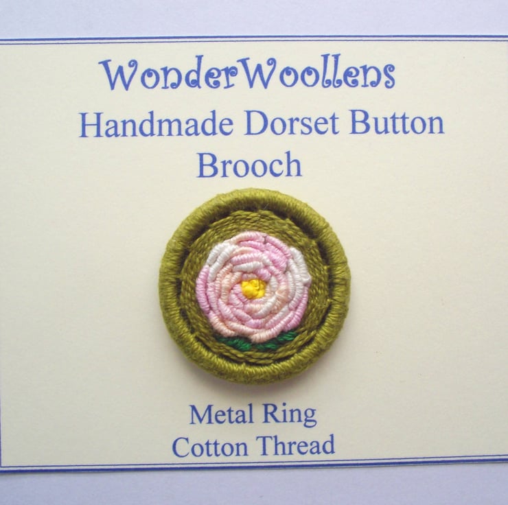 This listing is for a 3.5cm Dorset button brooch or pin. I made this by using various techniques of working cotton thread around a brass ring, forming a variegated pink rose with a yellow centre. There are also two green leaves, on a green back ground. I have attached a silver plated brooch back for easy attachment to clothing, bags etc.