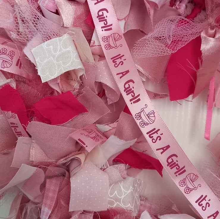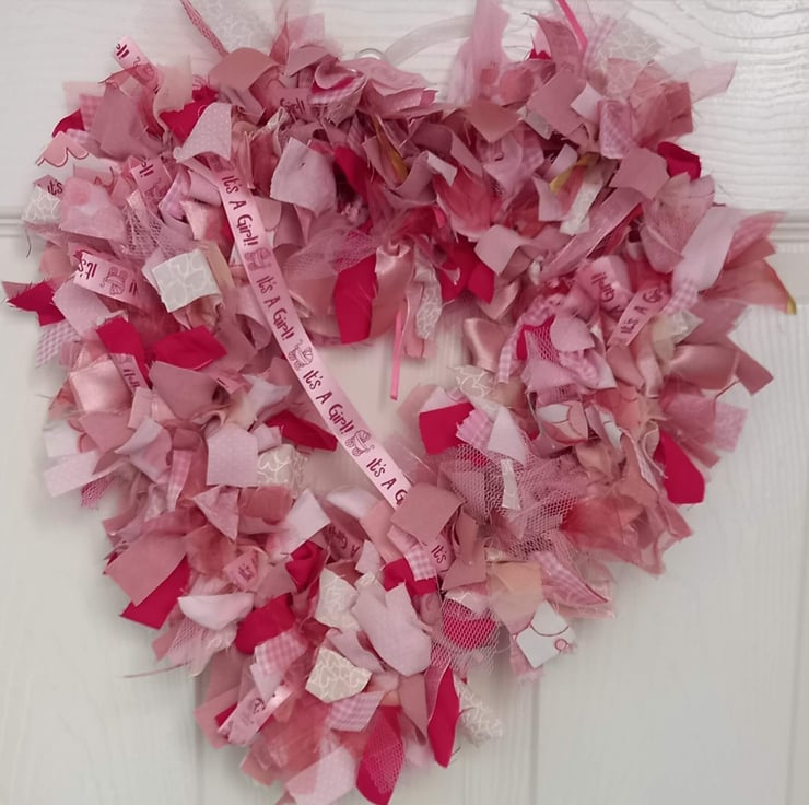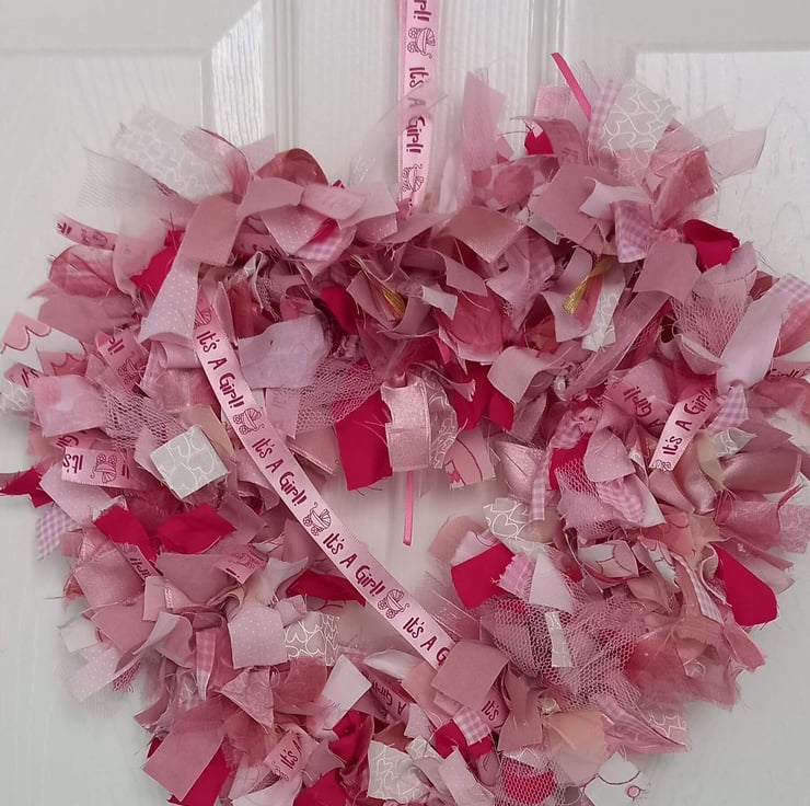 This beautiful handmade unique heart shaped rag wreath features fabric in the traditional pinks for baby girls. Includes lovely pink ‘Its A Girl’ ribbons.