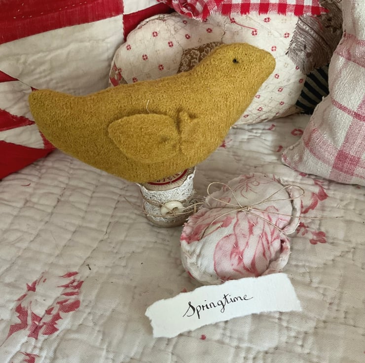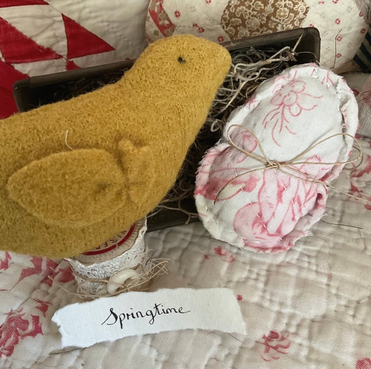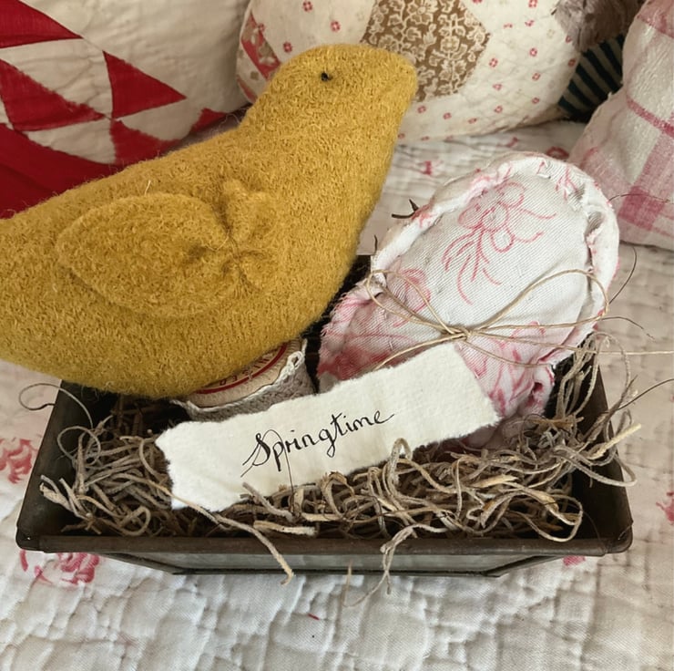It consists of a vintage mini loaf tin, containing lovely handmade pieces. Sitting in the Spanish moss is a golden primitive chick, made from boiled wool, giving them a lovely textural appearance. Each chick sits on a vintage wooden cotton reel, which has been decorated with vintage lace, button and twine, which means it can be displayed outside of the tin as a separate, stand alone piece.