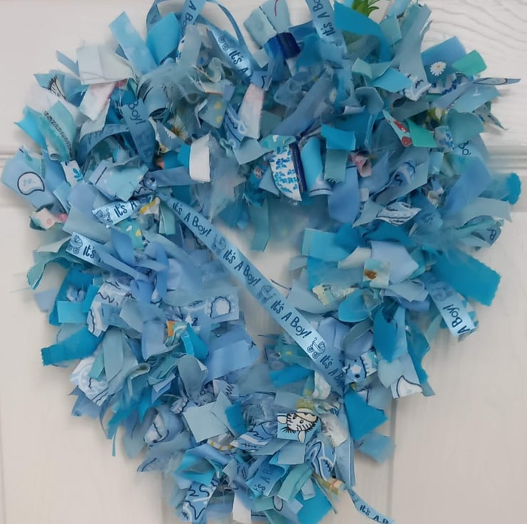 This beautiful handmade unique heart shaped rag wreath features fabric in the traditional blues for baby boys. Includes lovely blue ‘Its A Boy’ ribbons.