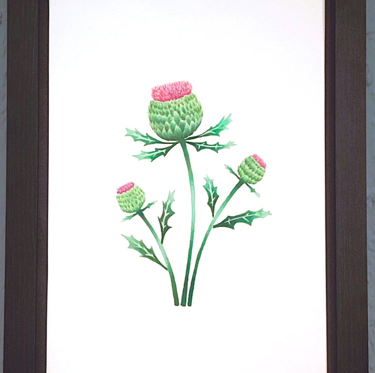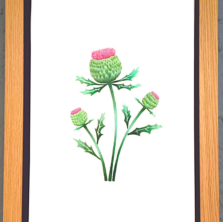 Framed high-quality coloured A3 print of my painting of purple/pink thistles on a white background with a hard backing. The print comes finished with a contemporary black border. Framed with an expensive Styrene Protective Perspex (which has same clarity of glass) ready to hang. Choose from three different types of frame; black, oak or dark oak(see images). Colours of print and border may differ slightly due to computer/phone settings. All purchases delivered within 7-10 working days.