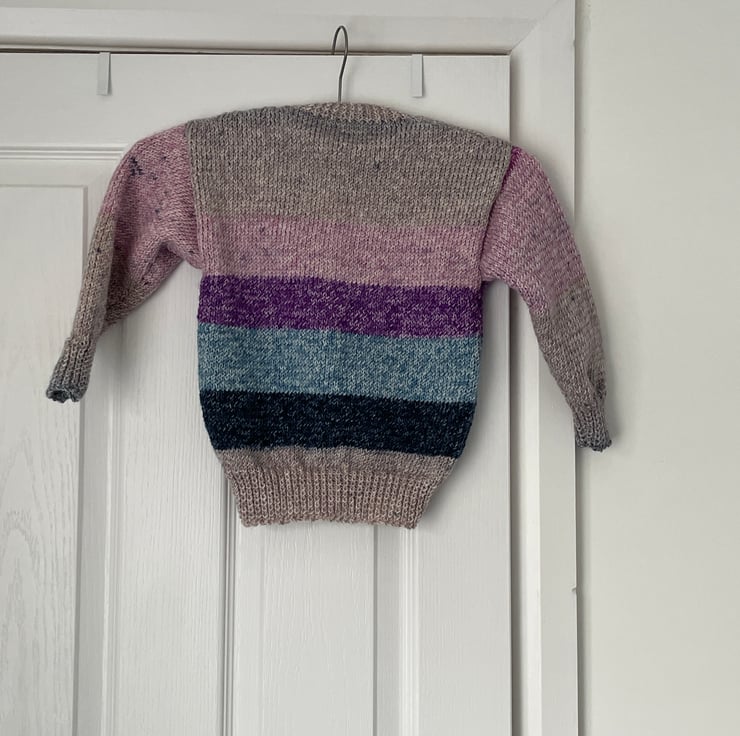Hand knitted Unisex Jumper with drop shoulders. In bright, blue, pink and purple double knitting wool.