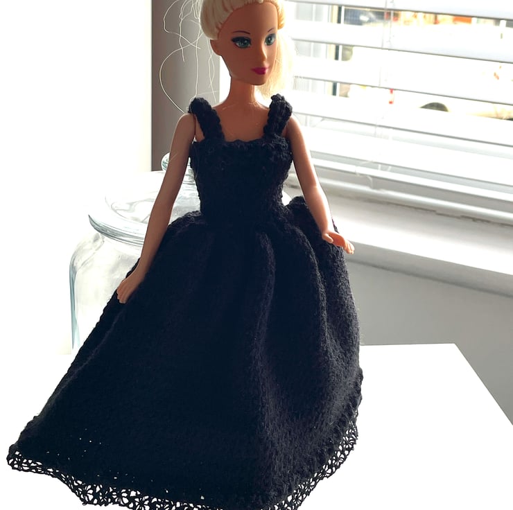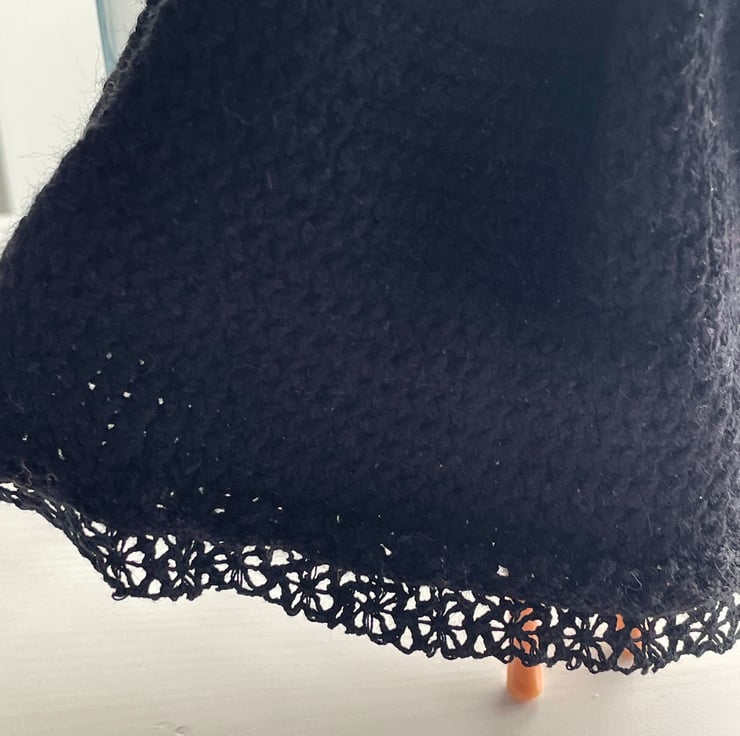 It is knitted in black double knitting wool. The dress has two straps and a fitted waist. It has black lace trim on the hem and around the top.