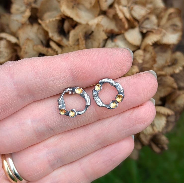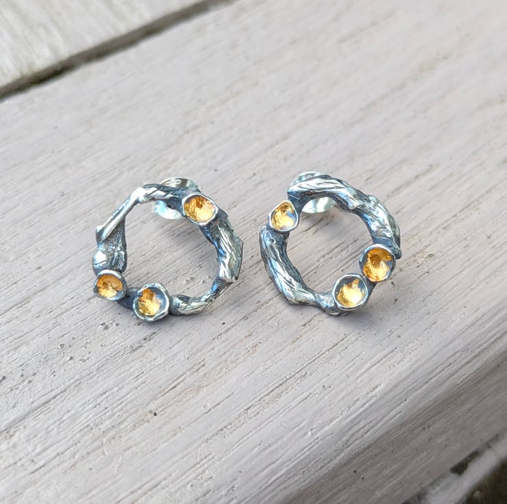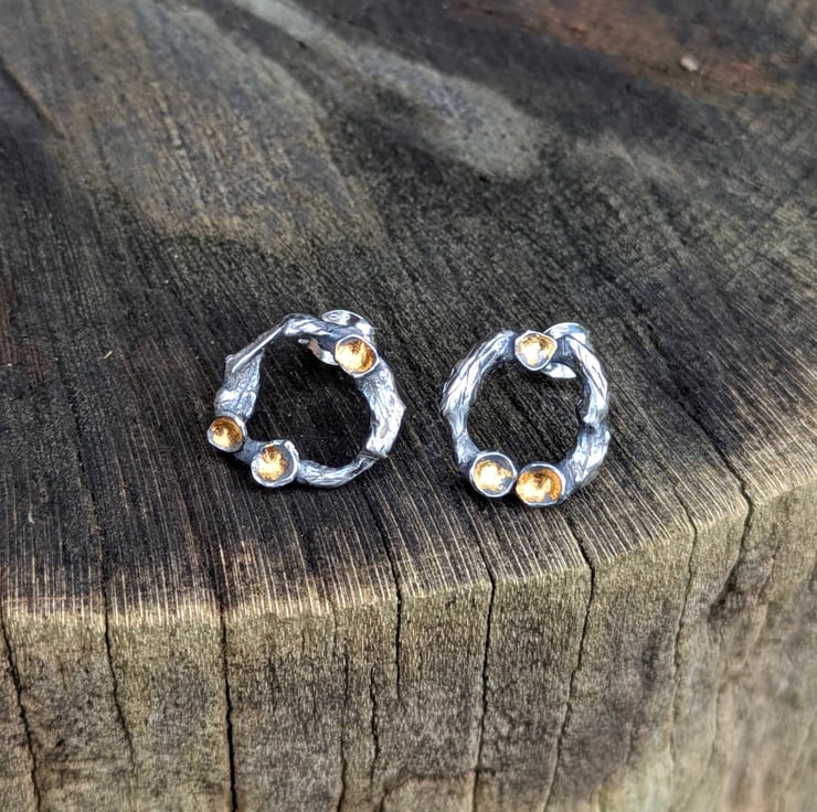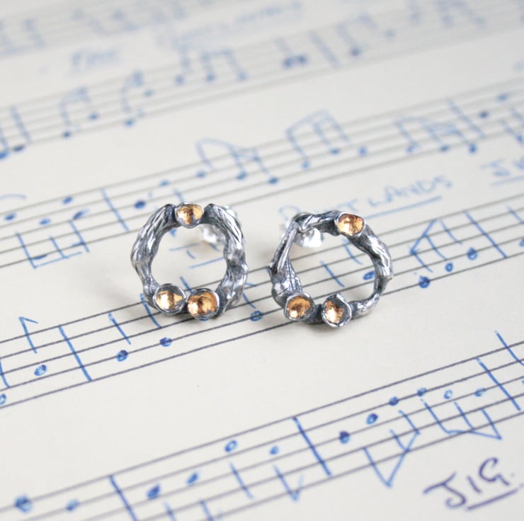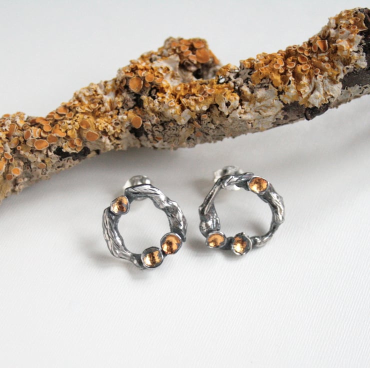 The exact shaped of each pair is unique just as lichen growing on a branch in nature would be and the earrings you receive may not be the ones in the images. The approximate diameter will be 12 mm. The little lichen shapes have 24 kt gold foil applied to them adding a touch of gold. The silver has been darkened using a patina to enhance the branch look of the earrings.
