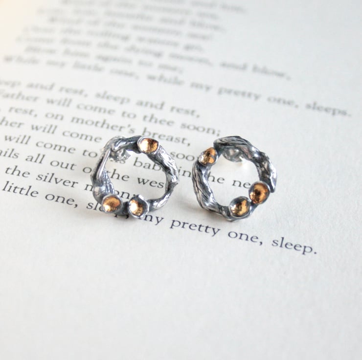These beautiful sterling silver branch earrings are inspired by nature and especially lichen growing on branches. They are handmade from recycled sterling silver and 24 kt gold foil which is applied using the ancient Korean Keum Boo technique. They would make a wonderful gift for a nature lover.
