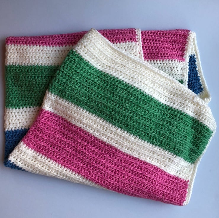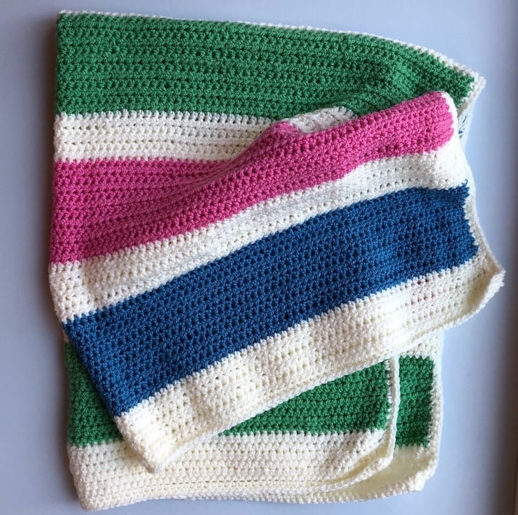 This listing is for a beautiful striped design baby blanket. It would make unique gift for a newborn baby which can be treasured for years to come. It has been made from green, pink and cream aran yarn and is approximately 100 x 75 cm.