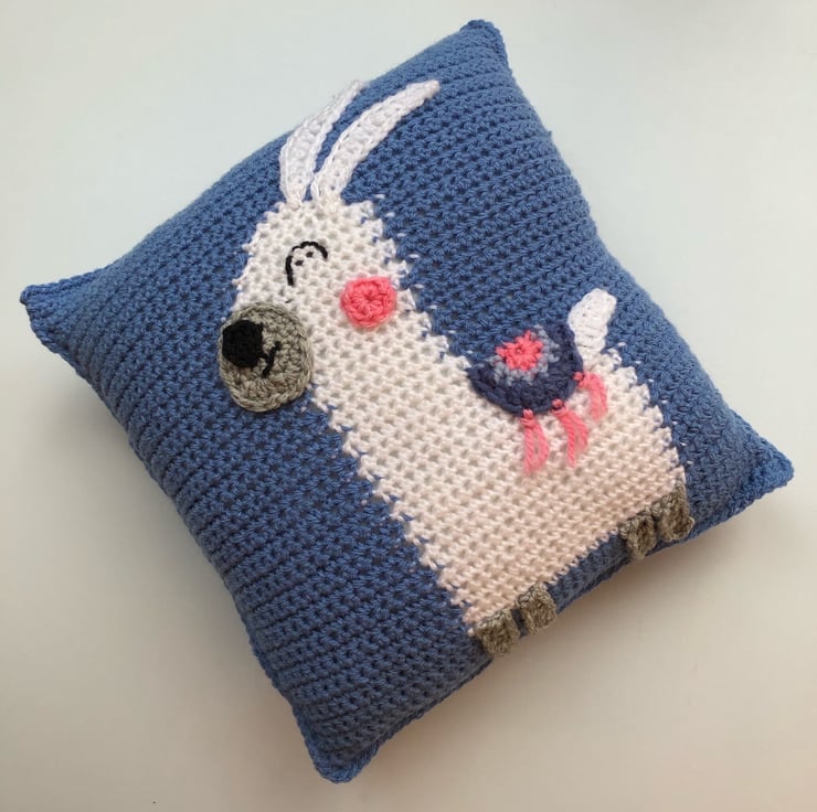 Bring a dash of fun with this cheeky llama scatter cushion. it s handmade from vibrant aran yarn and stuffed with a soft polyester filling. Each cushion features a cute llama design with added details sown on to give them their own unique character. This cushion is approx 35 x 40 cm.