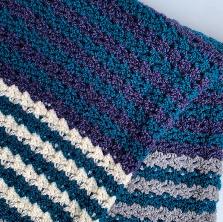 This listing is for a beautiful striped design baby blanket. It would make unique gift for a newborn baby which can be treasured for years to come. It has been made from purple and turquoise aran yarn and is approximately 100 x 100 cm.