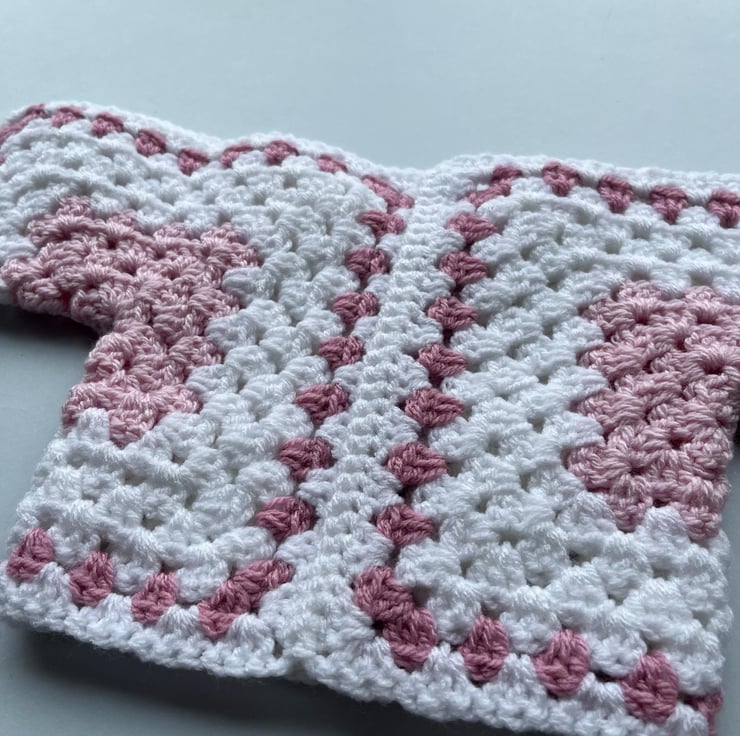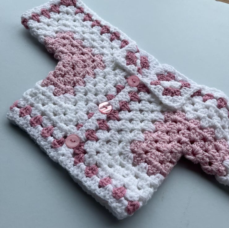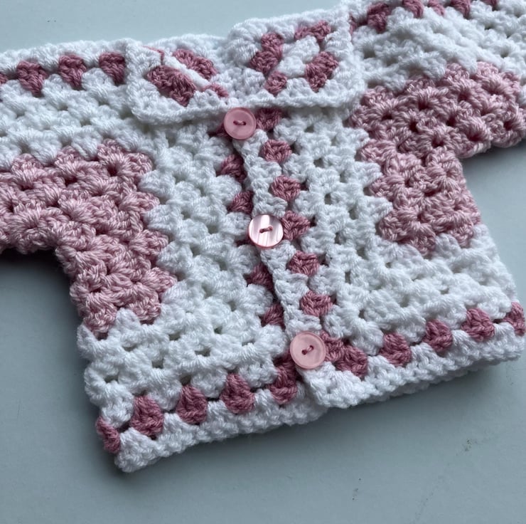 A beautiful, baby sized, 'Granny Square' inspired cardigan from the popular 'hex cardi' trend. This lovely warm cardigan makes the ideal gift for a little person. Crocheted in acrylic wool so it can be easily washed and with small button details