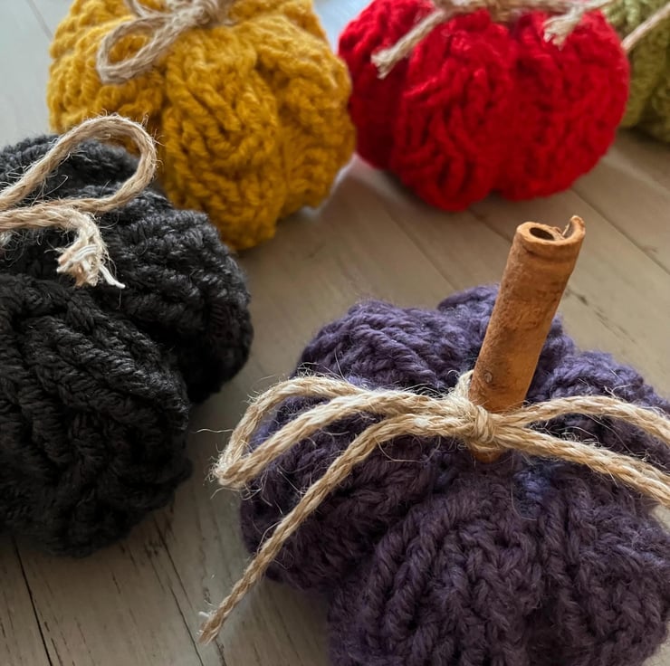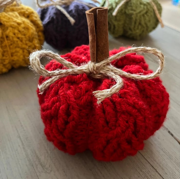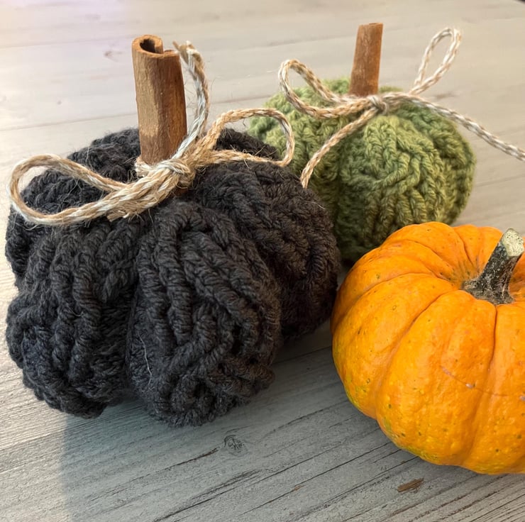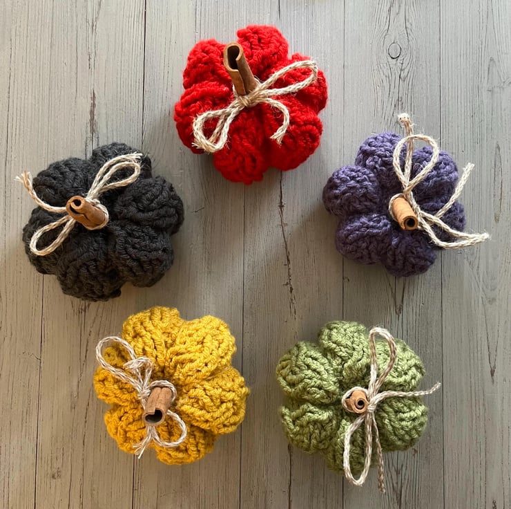 These crochet wool pumpkins have been handcrafted from acrylic yarn in a range of seasonal fall colours. Each autumn pumpkin has a cinnamon stick stalk and bow detail, giving a lovely warming scent perfect for your Harvest or Halloween celebrations.