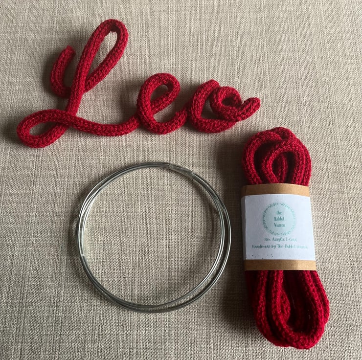 Our knitted wire art kit comes with handmade acrylic i-cord and steel wire which can be used to make knitted wire names, signs or shapes.