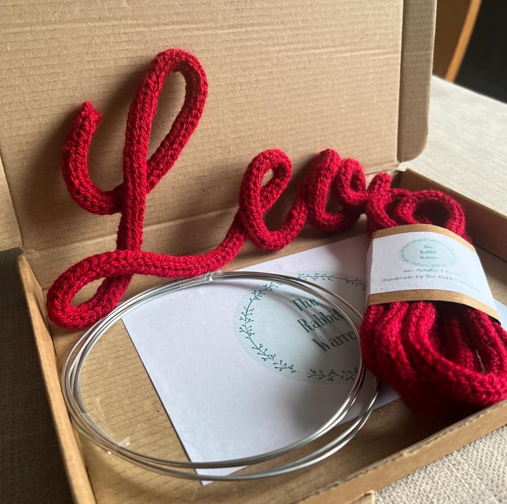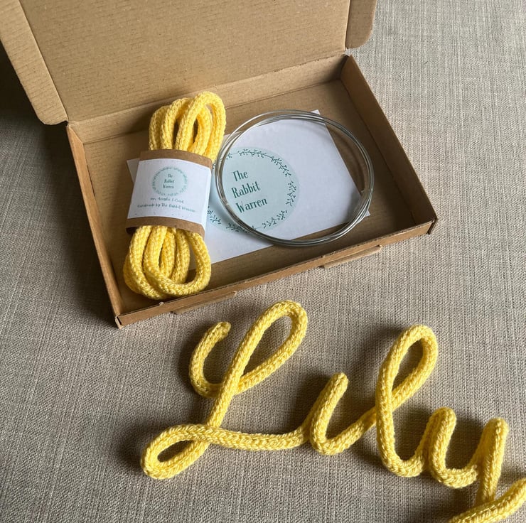 The wire art names photographed are examples of what you could make and are not included in the kits. If you are looking for a finished knitted name then we also sell these in our shop or please drop us a message.
