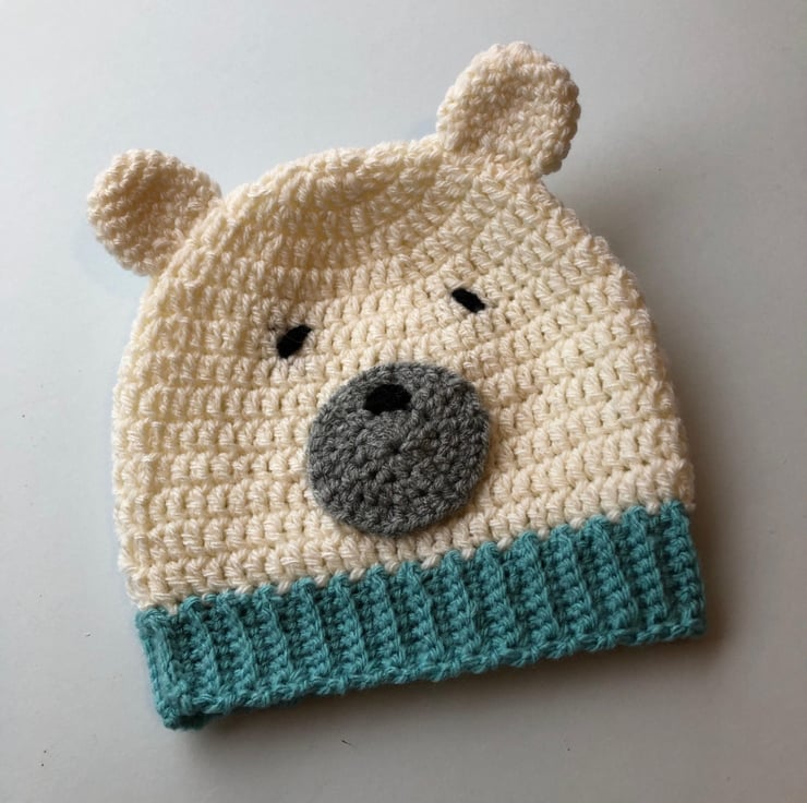This gorgeous polar bar hat, with a friendly face and round bear ears makes the perfect hat for any winter arctic explorers. Made from soft, cosy aran weight wool it will keep little (and big!) heads warm through out the autumn and winter months.