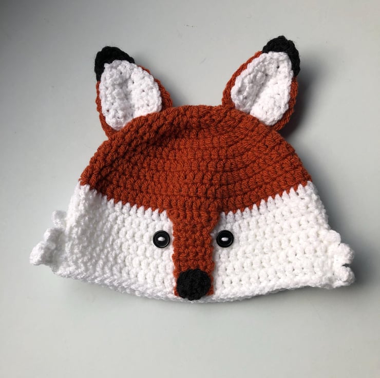 This cheeky fox hat is made from a beautiful autumnal burnt orange acrylic wool and is crocheted by Rachel and Ann. He has a lovely button eyes, a white ruffwhiskers and tall pointy ears. Each hat is carefully made and is unique, making it the perfect gift for little (and grown up!) fox fans. Its lovely thickness, from being made with aran weight yarn, makes it an ideal autumn and winter hat and is perfect for a stomp through you local woodland - maybe you will even spot a foxy friend!