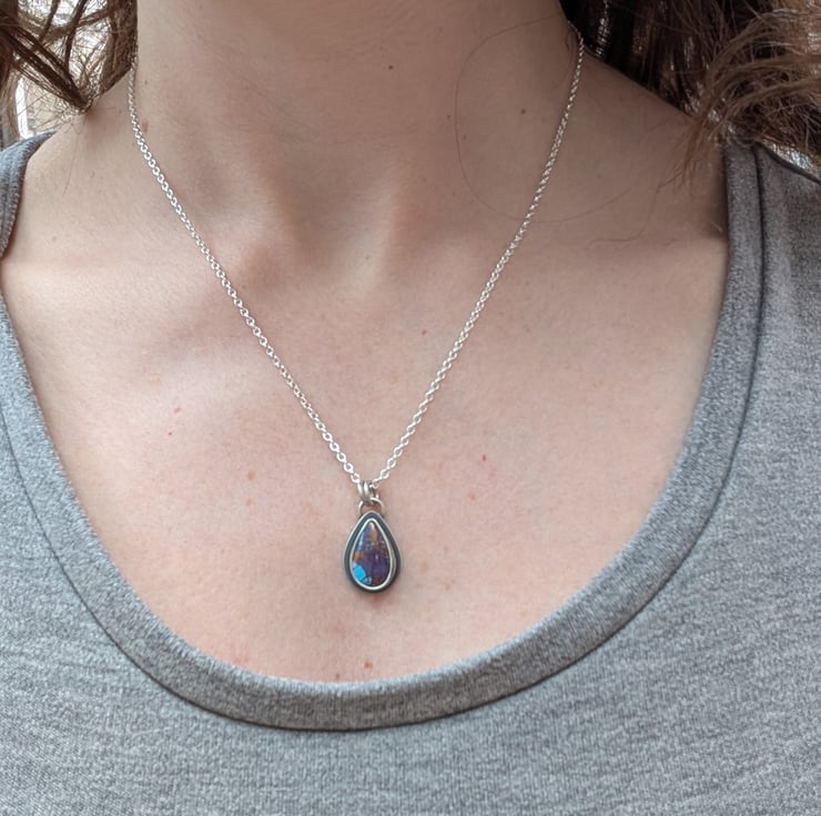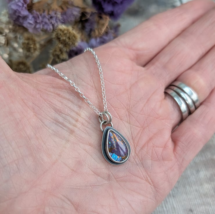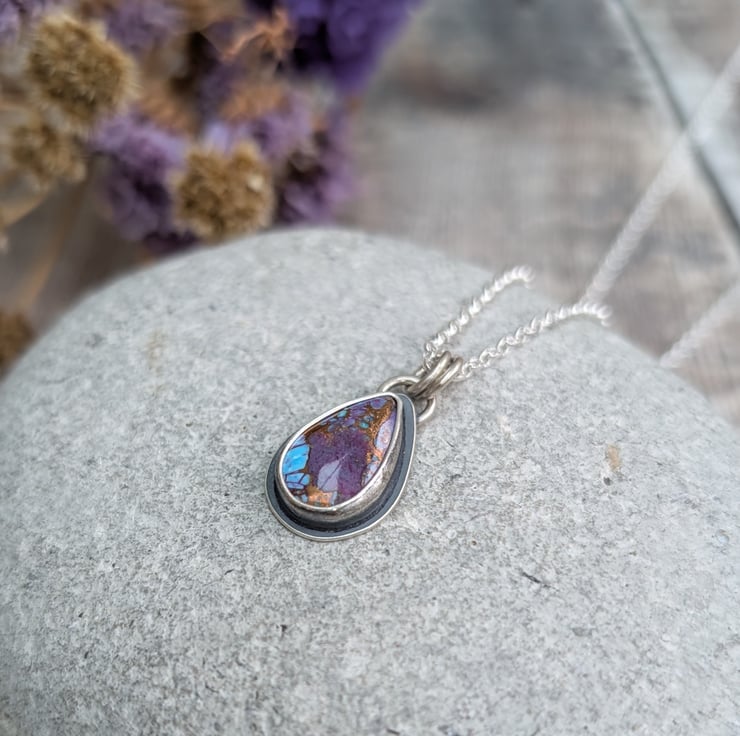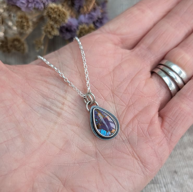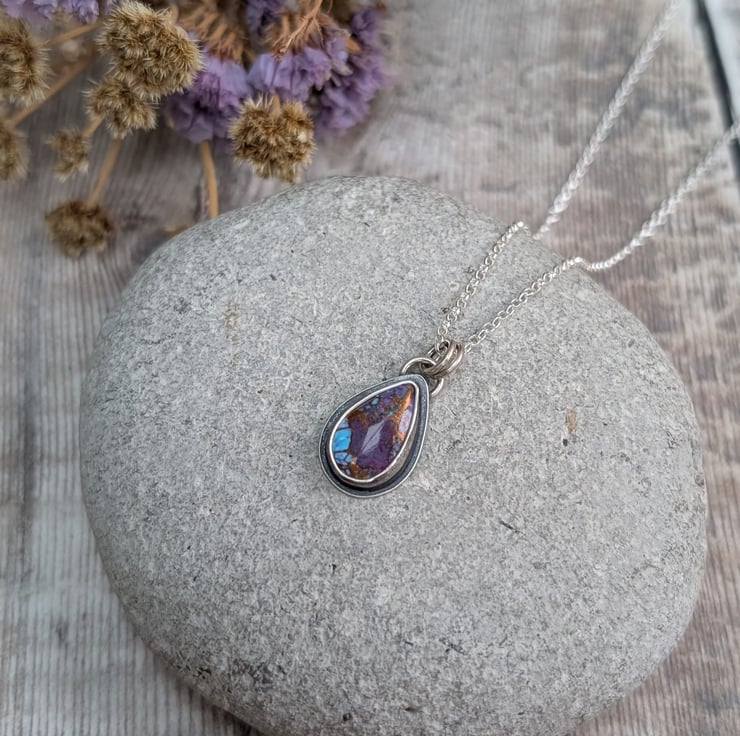 This handmade necklace features a striking Mohave Turquoise stone, set in oxidised recycled sterling silver for a bold contrast against its rich colours. The pendant hangs from a bright sterling silver chain, creating a balance between darkened silver and polished shine.