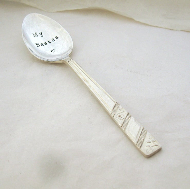 A hand stamped vintage teaspoon with the words 'My Bestea' and a little heart. An ideal gift for a tea-loving best friend!