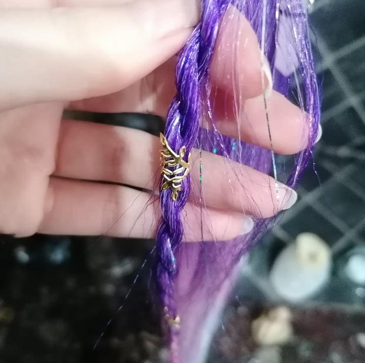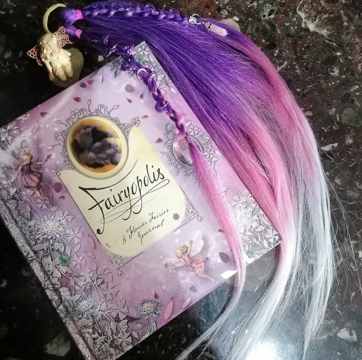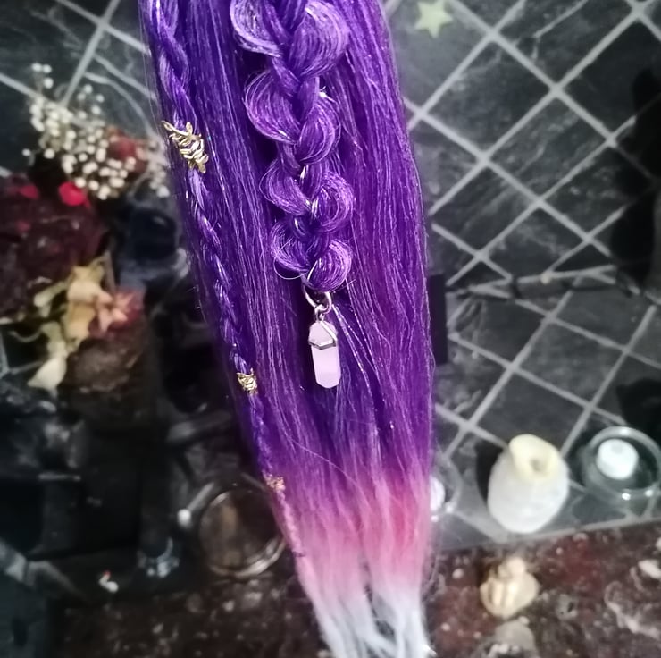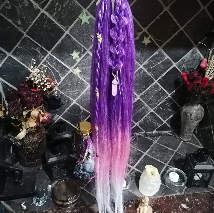 Step into a realm of fantasy with this fairy-inspired pink and purple ponytail, shimmering with strands of delicate tinsel that catch the light like enchanted stardust. Adorned with a soft pink crystal trinket, it carries the energy of ethereal magic, while gold leaf hair cuffs add a regal, otherworldly touch. This whimsical creation feels as if it was spun by woodland fae, perfect for those who long to embrace the magic of the unseen.