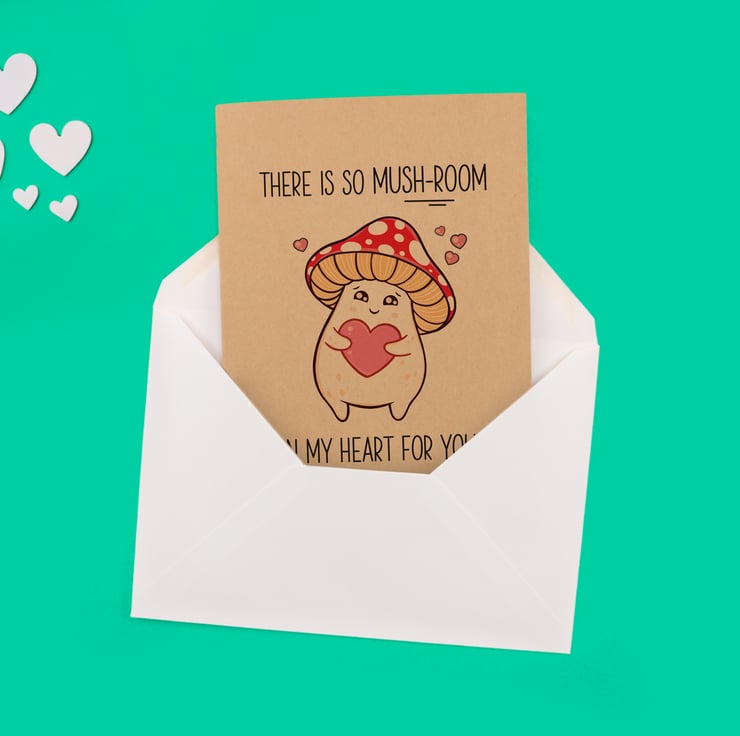 Make Mum smile this Mother’s Day with this adorable handmade A5 greeting card featuring a cute kawaii mushroom and a funny fungi pun – ‘There is so mush-room in my heart for you!’