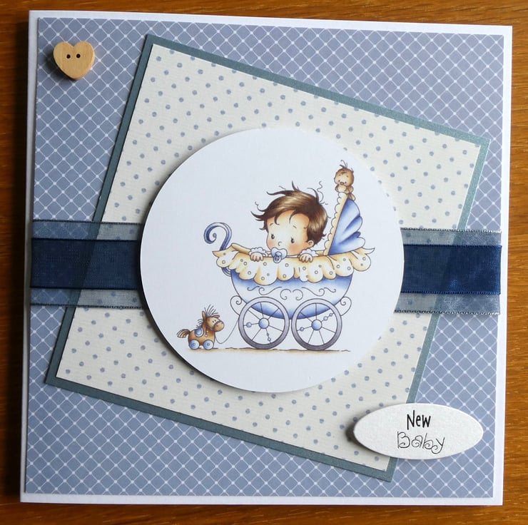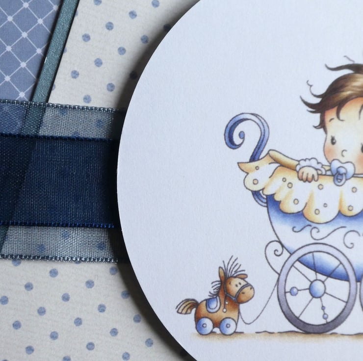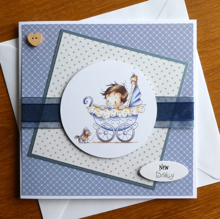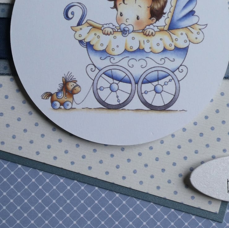 With the messages New Baby and Best Wishes, this cute card for a new baby boy has a printed topper showing a baby boy sitting in a pale blue pram, with a cute little bird perched on the hood and a pull along horse toy following behind.