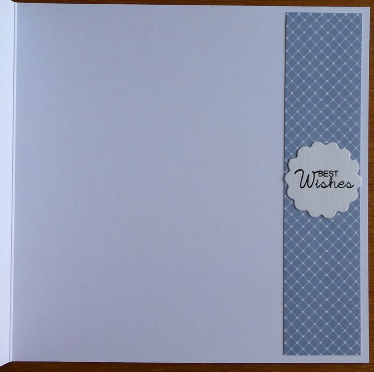 The inside of the card has a band of matching pale blue and white card down the right hand side with the message best wishes in a scalloped circle, leaving plenty of space for you to write your own message.