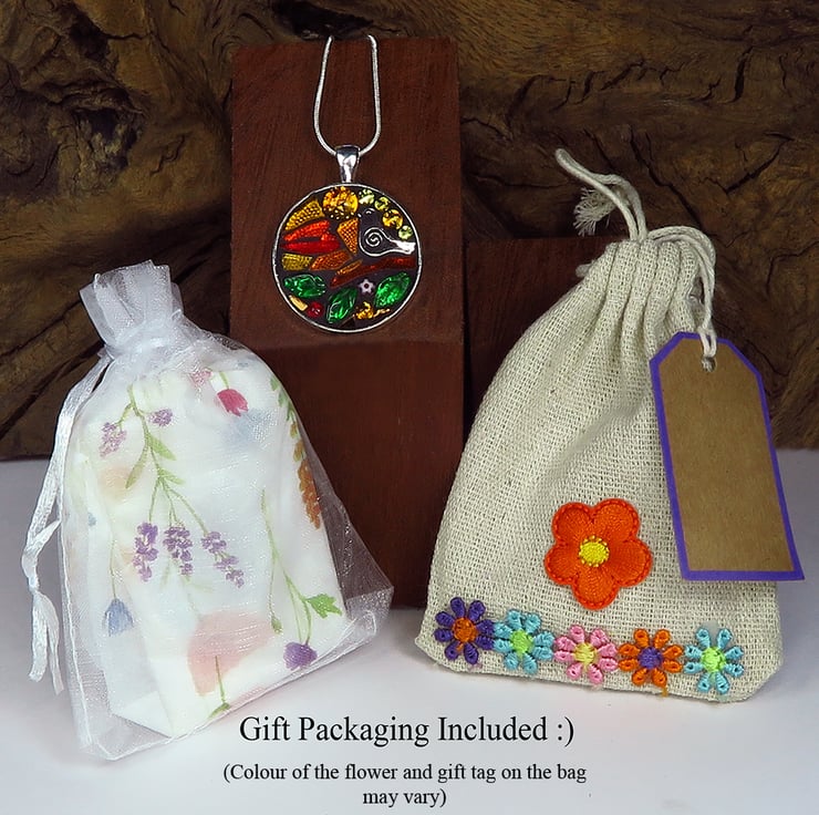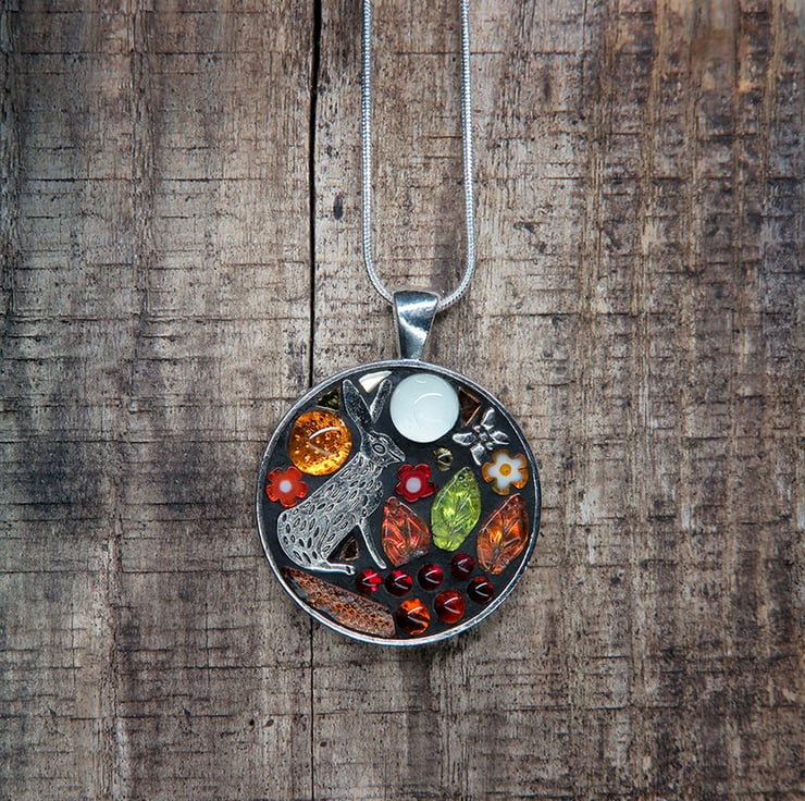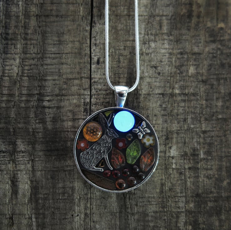 A handmade stained glass and bead mosaic pendant featuring a tiny silver toned Hare in an autumn inspired landscape with a glow in the dark glass bead to represent the moon.