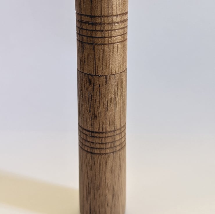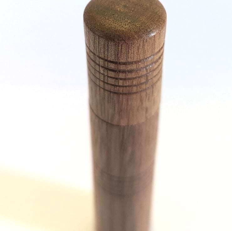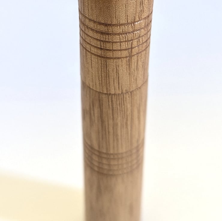 This narrow, elegant, hand-turned oak needle case has an internal depth of 4.5cm, with another 1.5cm within the lid, and an internal diameter of 7mm, making it ideal for short sewing needles or other short, thin items.