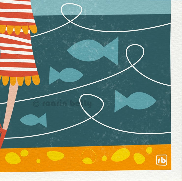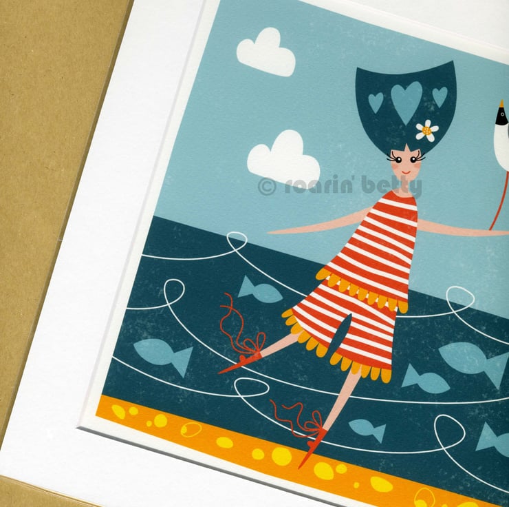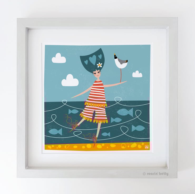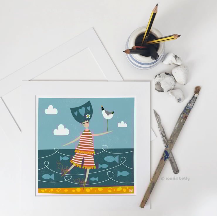 'Swimming With The Fishes' is my original design ©. I've printed the illustration onto archival watercolour paper, using archival Lucia Pro inks. This process gives you long lasting colours on beautifully textured paper. After printing I mount the illustration into a white, acid free bevel edge mount, ready for you to pop it into your favourite 10x10 inch (254 x 254mm) frame.
