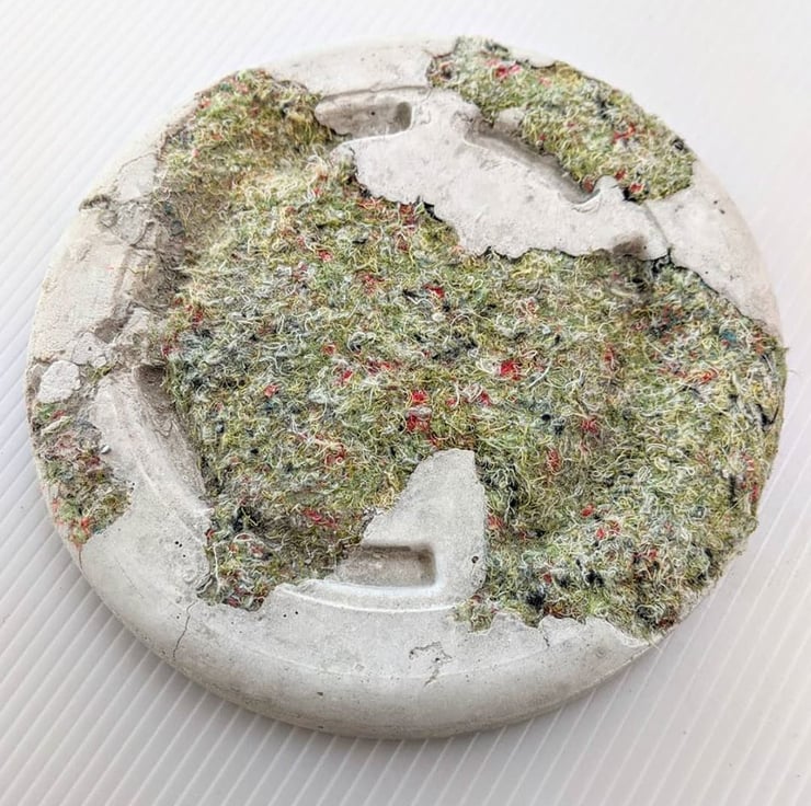 I create coastal inspired textures using a combination of embellishing and embroidery; blending a variety of recycled fabrics to create subtle variations in tone. These are stitched inside waste plastic to cast true to life pieces with cement giving a distinct contrast between the manmade structure of the packaging and the soft natural textures of the textiles.