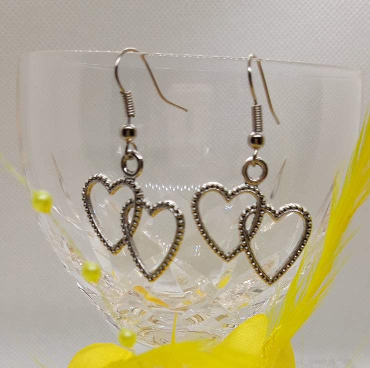 Hypoallergenic ear hoops with dangle double heart detail which measures approximately 2cm.