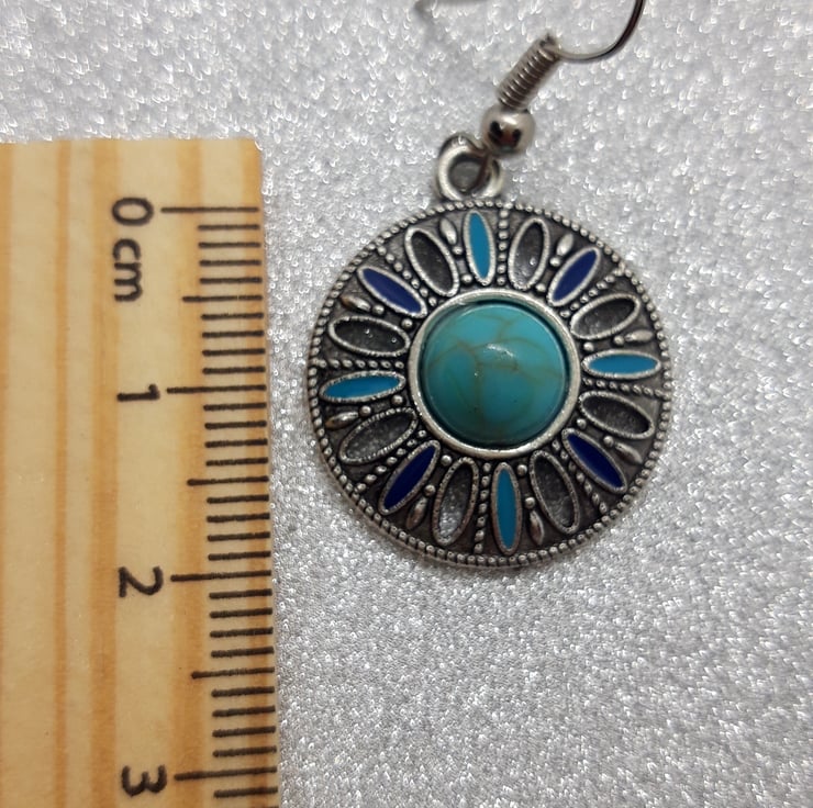 A pair of earrings with round, sunburst design in silver and turquoise enamel.