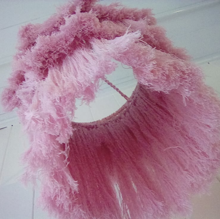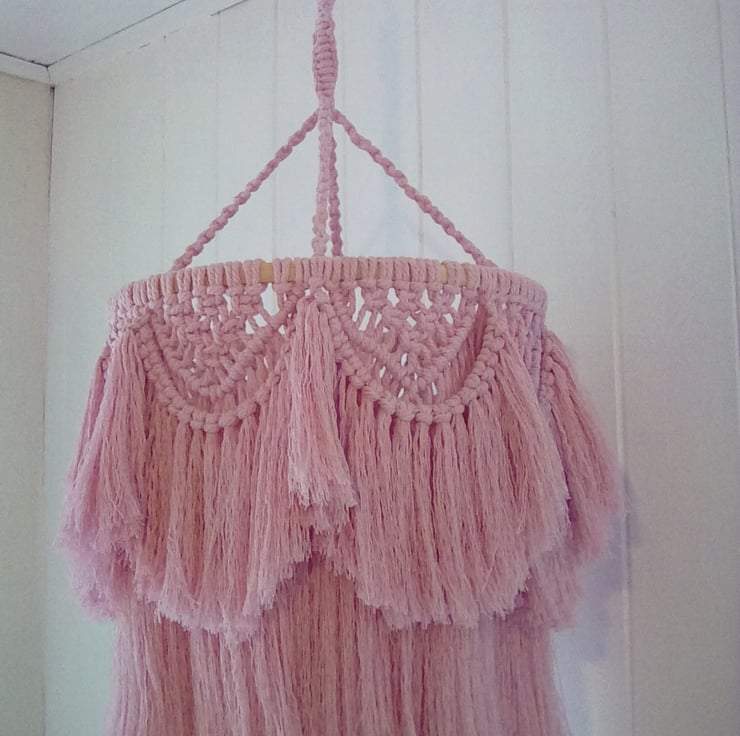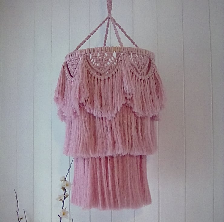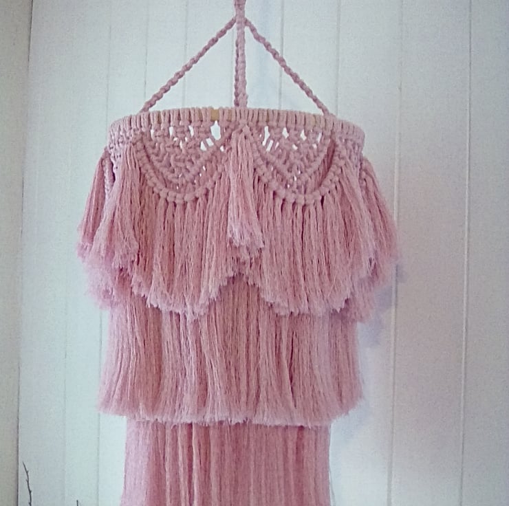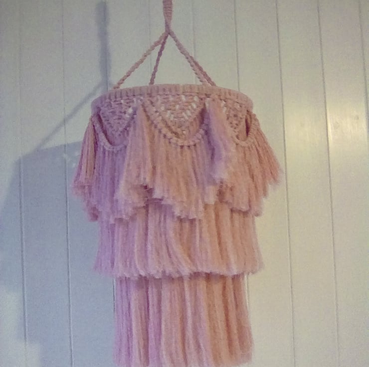 Feminine macrame light hanging inspired by Degas' pastel drawings of ballerinas on stage.