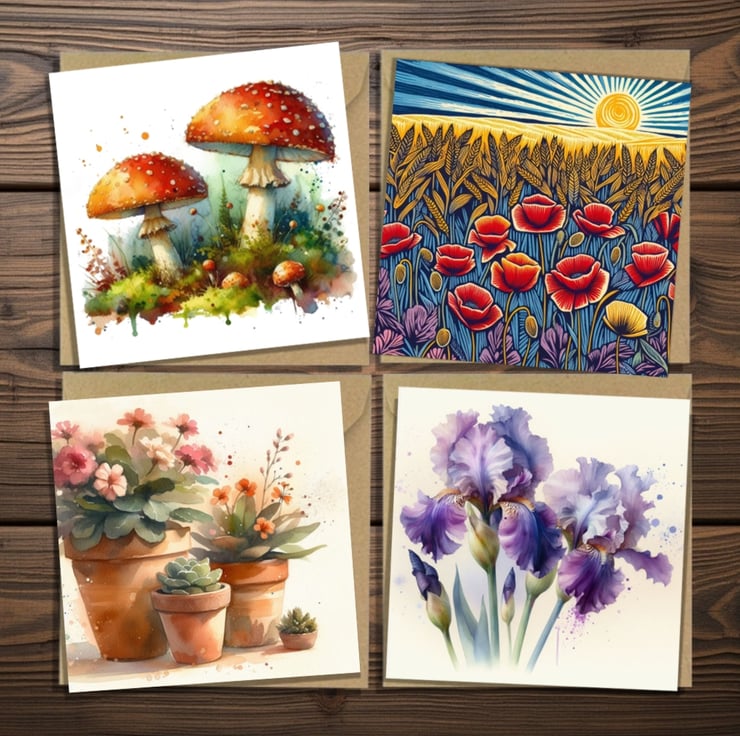 A collection of four 148mm square cards depicting colourful botanicals. Ideal for any occasion.. Each card has been professionally printed on FSC registered cardstock. Cards come with complementary kraft envelopes.