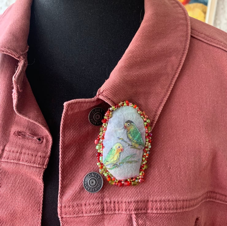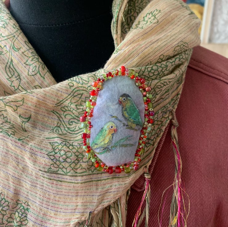 Handmade tie dyed fabric brooch with hand-painted lovebirds design in shimmering colours. Edged with hand sewn glass beads & finished with safety pin fixing.