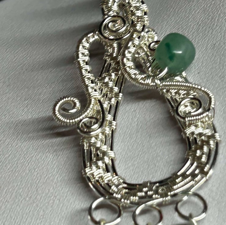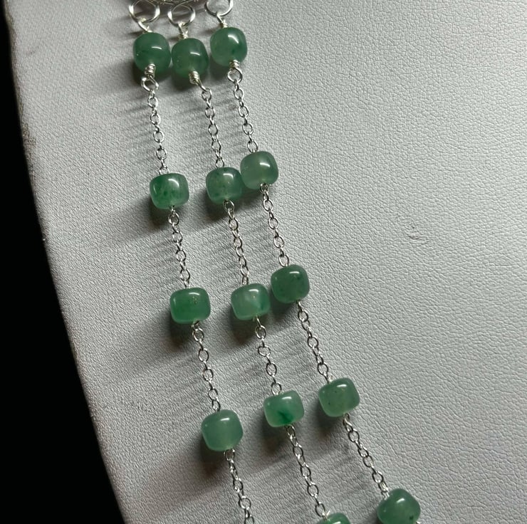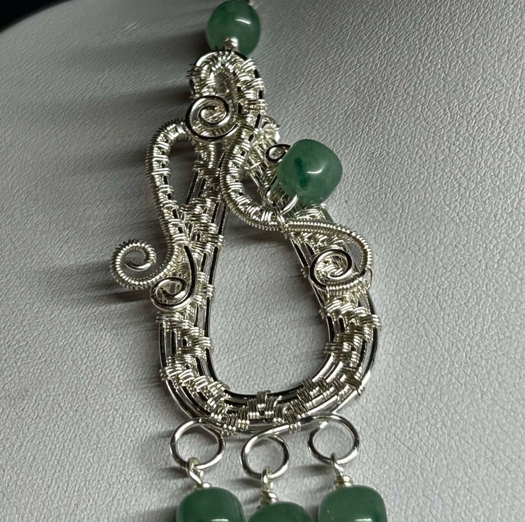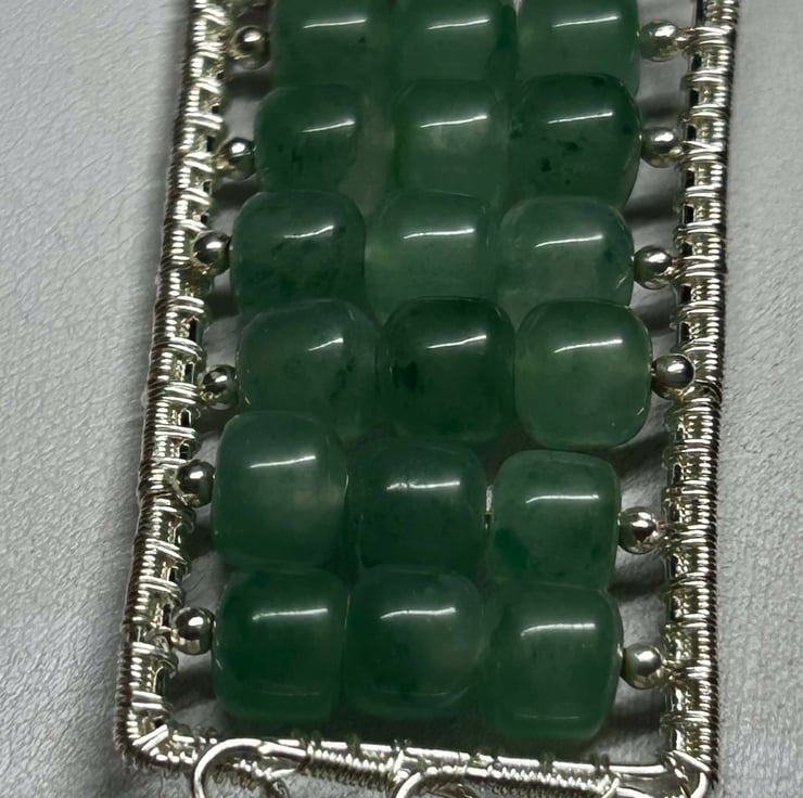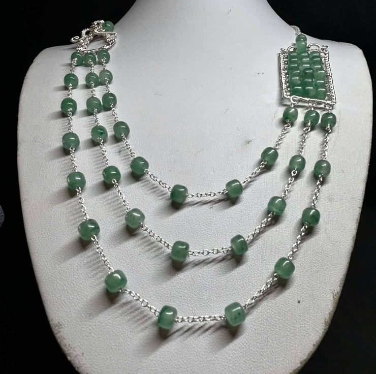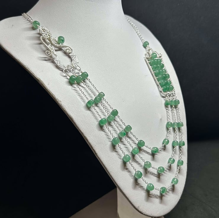 I used tarnish-resistant silver-plated copper wire to build the piece. The intricate wire-wrapped connector allows for three swathes of jade to sweep around the neckline towards the fabulous abacus construction of the second connector. Everything is made by hand, including the lengths of jade station chains which cascade from the design.
