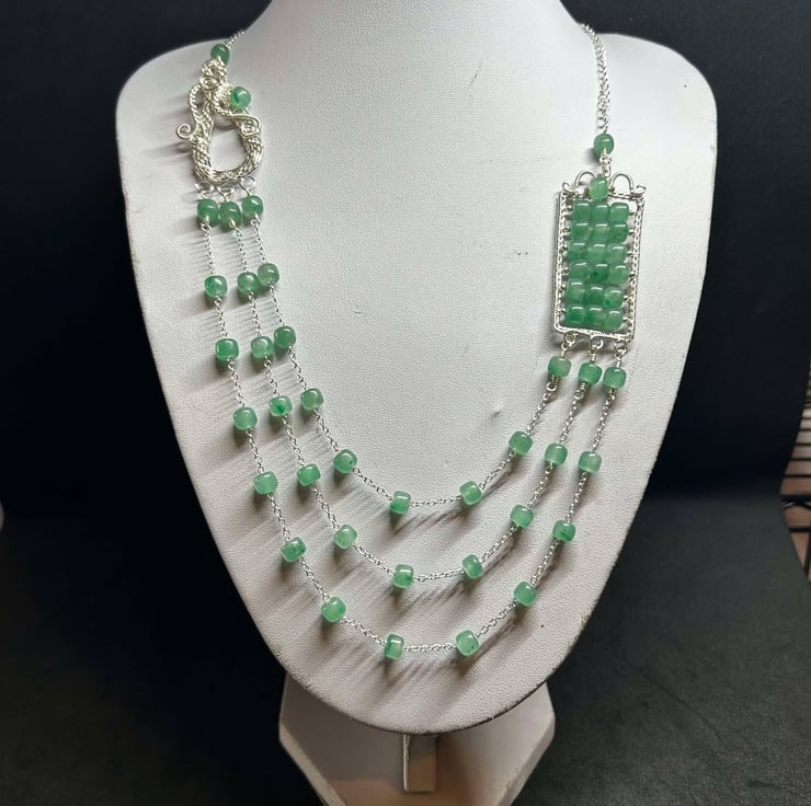 Jewellery Maker TV approached me with the fabulous parcel of Dulong Jade and asked me to make something spectacular with it to be shown on their shows. I wanted to make something that really showcased the gemstone but would have real impact around the neckline.