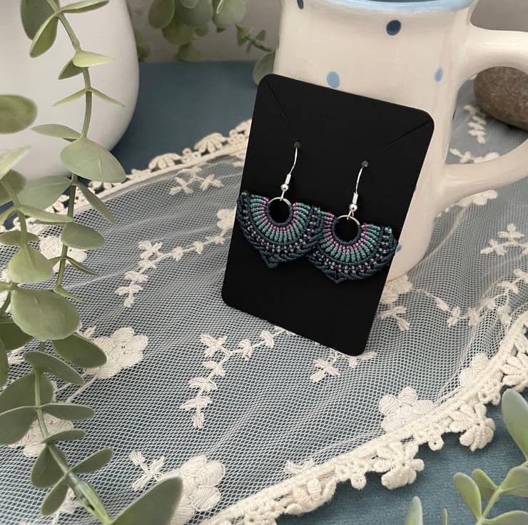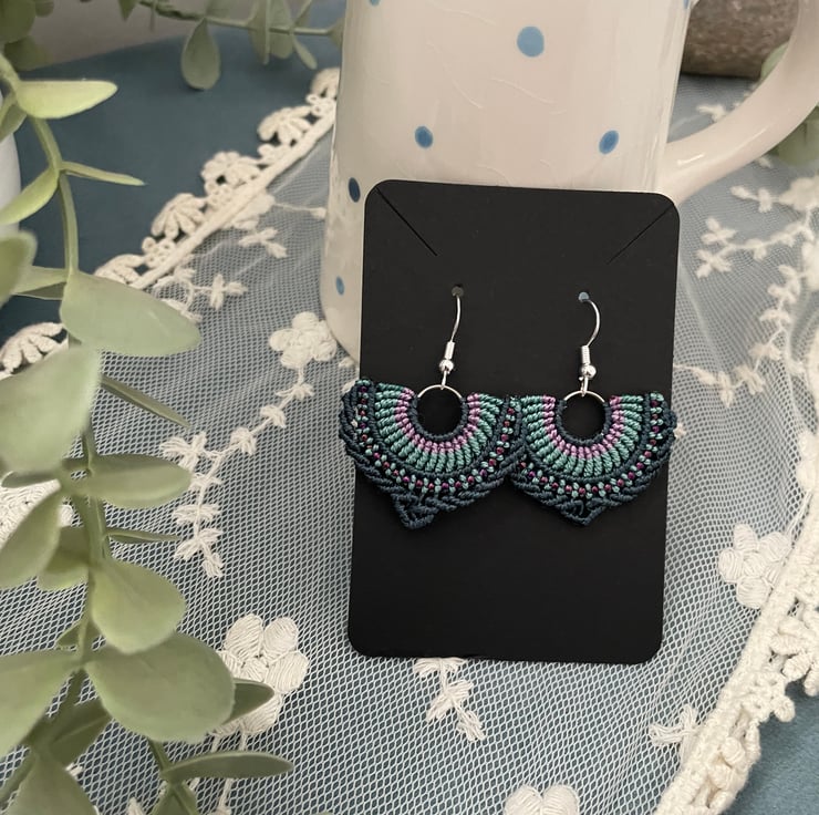 Designed and created by me in my Kent studio in pretty colors of lilac and green interwoven with tiny glass seed beads and using unbreakable c-lon macrame thread knotted into the intricate design .