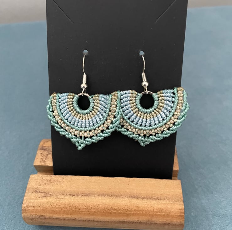 The fan shape is formed around a central jump ring to which I have attached a silver plated earring wire for pierced ears.