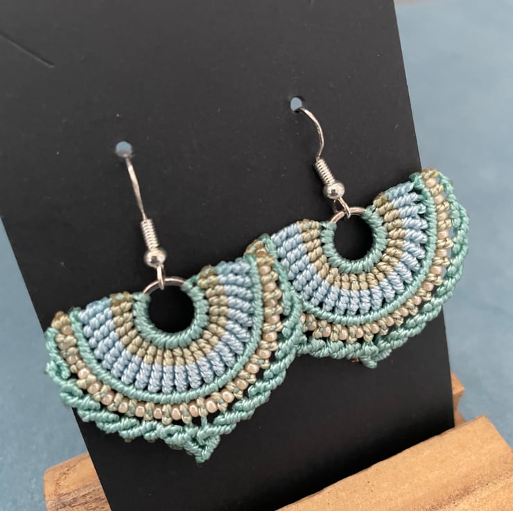 Designed and created by me in my Kent studio in pretty colors of lilac and green interwoven with tiny glass seed beads and using unbreakable c-lon macrame thread knotted into the intricate design .