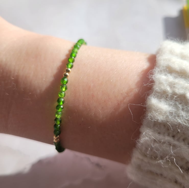 Vibrant green chrome diopside gemstone bracelet with gold filled beads. This delicate bracelet is finished with a gold filled spring ring clasp and extension chain giving an adjustable length of 17.5-20cm. I use high quality, strong, flexible beading wire and all components are gold filled.