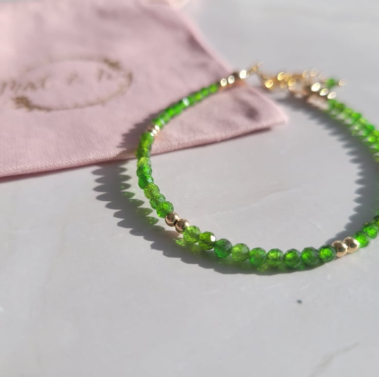 A vibrant, delicate and versatile piece of jewellery, this bracelet is made with chrome diopside and gold filled beads. Perfect for gifting on birthdays or anniversaries.