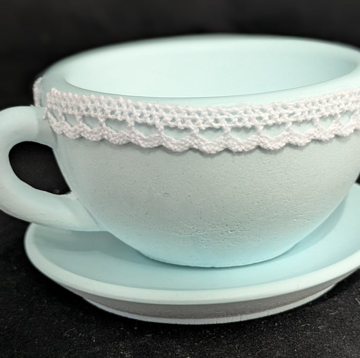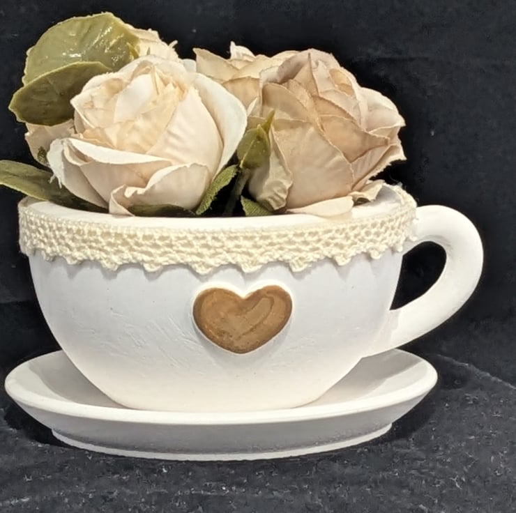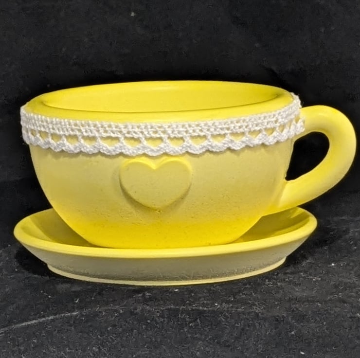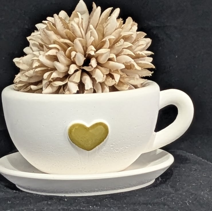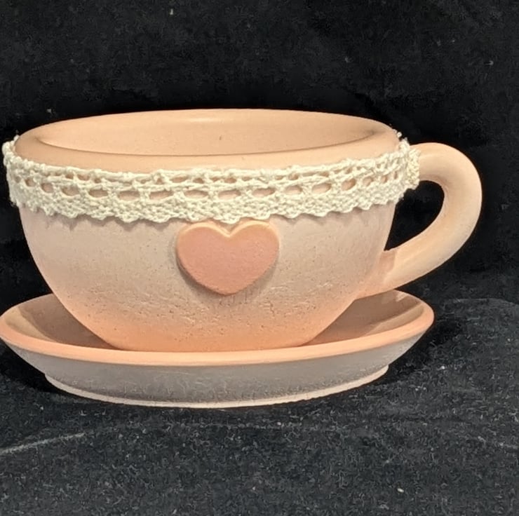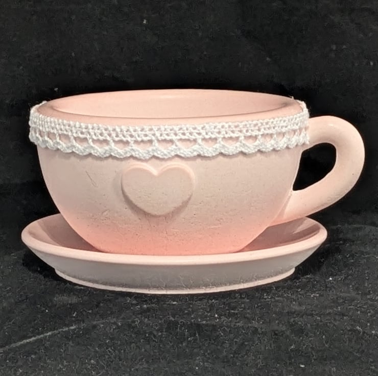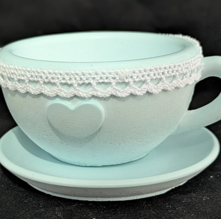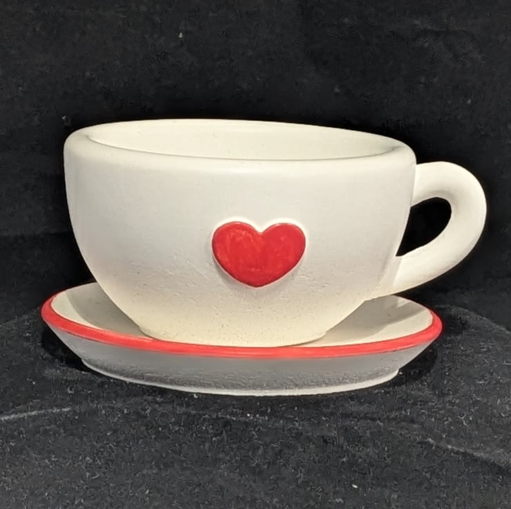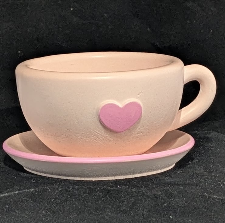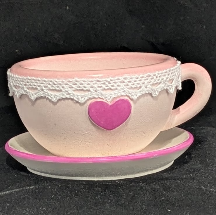 Mini cup and saucer handmade out of Aqua cast and pigment dye and the hearts are hand colored using paint pens.