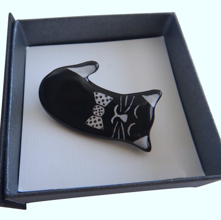 This Handmade Fused Glass Cat Brooch is created by GlassMad in Scotland. It features a unique design and is hand-crafted with fused glass. Perfect for cat lovers looking for a stylish accessory.