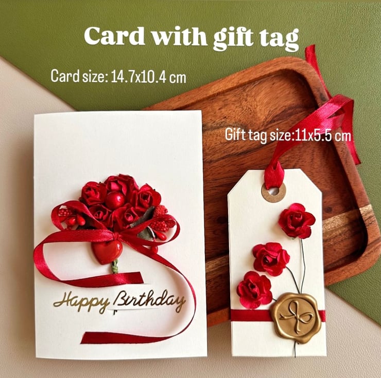 Make someone’s special day even more memorable with this handmade personalised birthday card with an elegant 3D floral design. This luxury card is crafted with red paper roses with a red heart charm and ribbon.