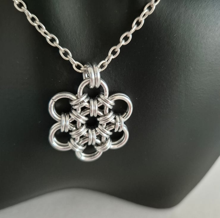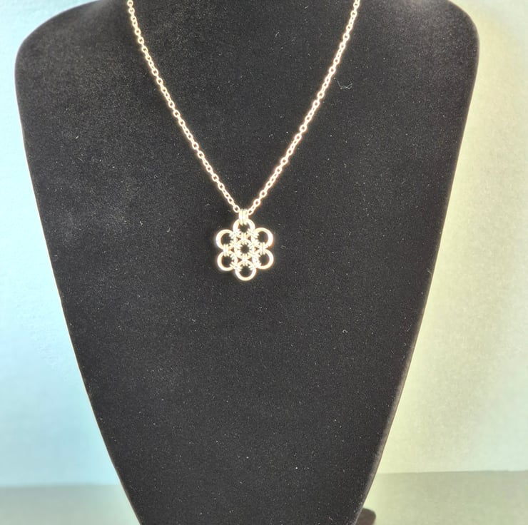 Handcrafted chainmaille necklace using Japanese Weave. Interwoven rings create a pretty daisy shape. Silver plated 45cm chain.