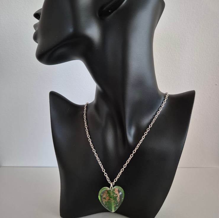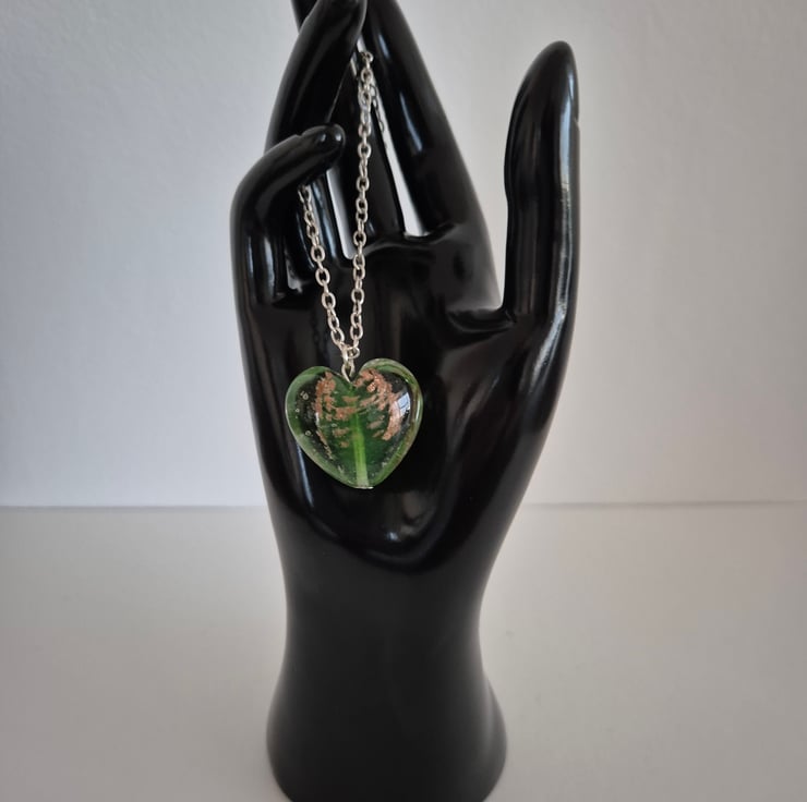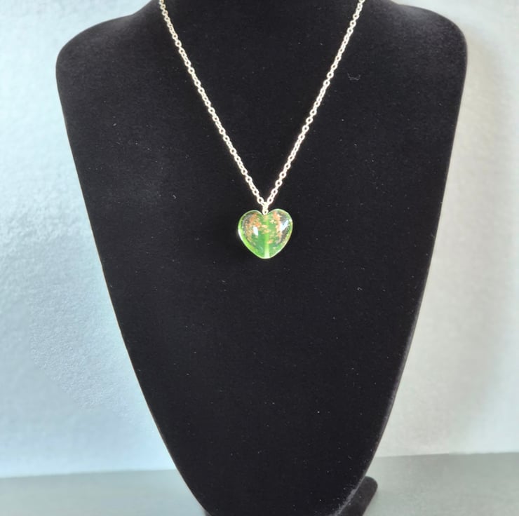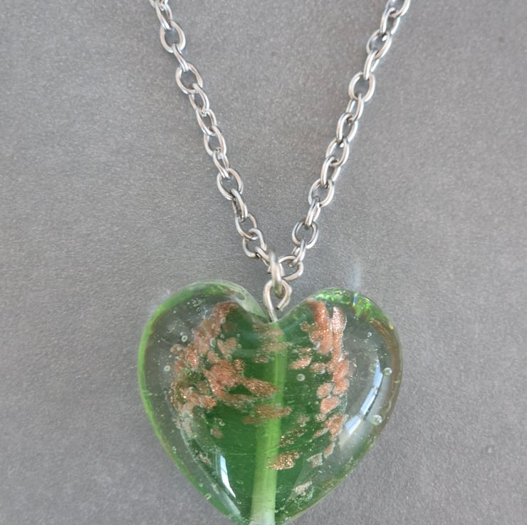 Handcrafted, pretty, green glass heart hecklace with bronze flecks. Silver plated 45 cm chain. Heart is 2cm length and 3cm width.