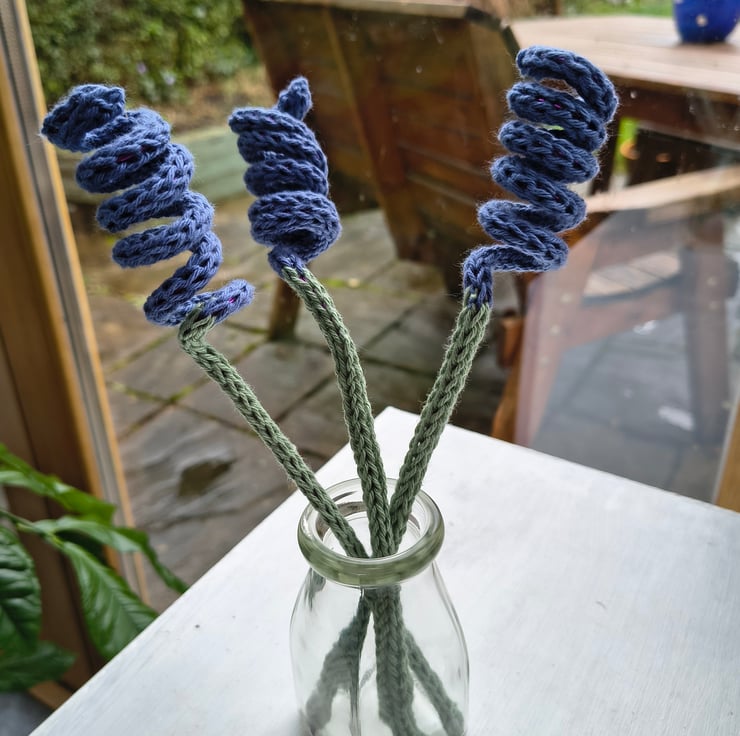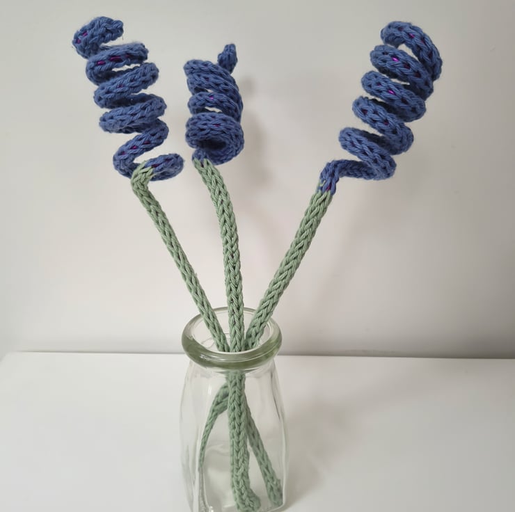 This simple yet beautiful lavender flowers are knitted in 100% cotton yarn. The stem is a beautiful soft green and the flowers are a delicious blue purple mix which is perfect for an everlasting lavender.
